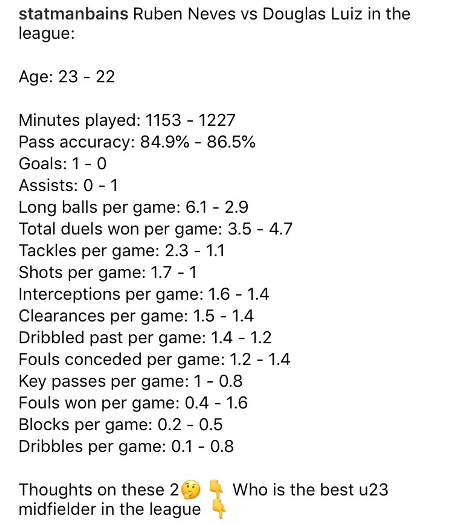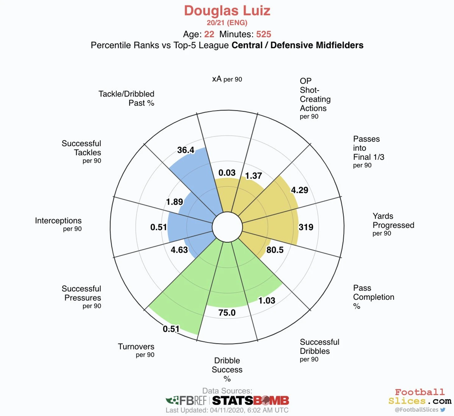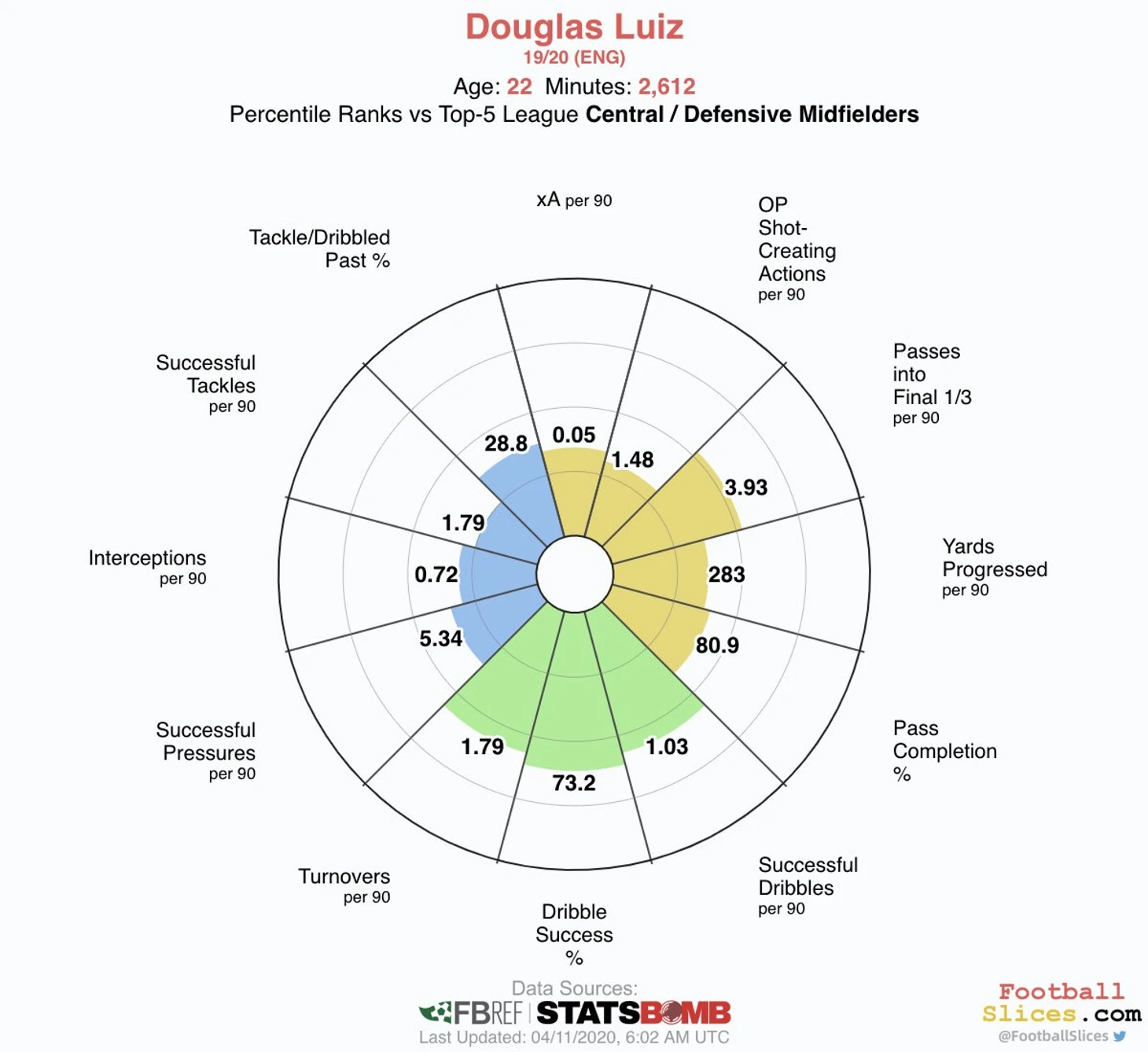 Удивительно, но после рестарта у Дугласа Луиза был самый высокий процент этих самых выигранных единоборств с ошеломляющими цифрами в 67,85%. Бразилец добился почти 20%-ого улучшения. Этот процент успеха стал самым высоким в лиге для опорных полузащитников, на втором месте Матео Ковачич из «Челси» с 63,92%. Кроме того, этот показатель был существенно выше среднего показателя по лиге (57,44%).