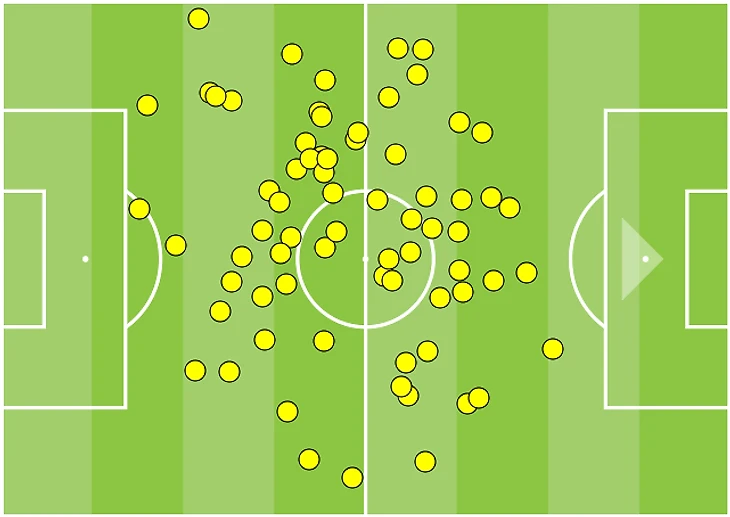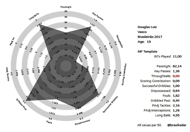 Играя воланте или восьмерку Дуглас вовсе не стеснялся подключаться в атаку. Плюс он очень хорошо держал мяч под прессингом – процент точности 83.