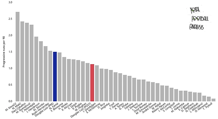 Теперь глянем на статистику количества прогрессивных продвижений мяча. На графике видно, что Луиз стал делать меньше прогрессивных продвижений после рестарта. До остановки сезона Луиз выполнял 1,50 прогрессивных продвижений и входил в десятку лучших опорных полузащитников. Однако если посмотреть на игроков с более высокими показателями, то увидим, что за исключением Дани Себальоса и Маттео Гендузи, больше прогрессивных продвижений мяча, чем Луиз, выполняли только игроки из первой шестерки команд АПЛ. Ковачич возглавляет этот список с 2,71, за ним следует Неманья Матич с 2,42. В свои заслуженные «околотопы» с перспективой роста Дугласа можно смело записать.