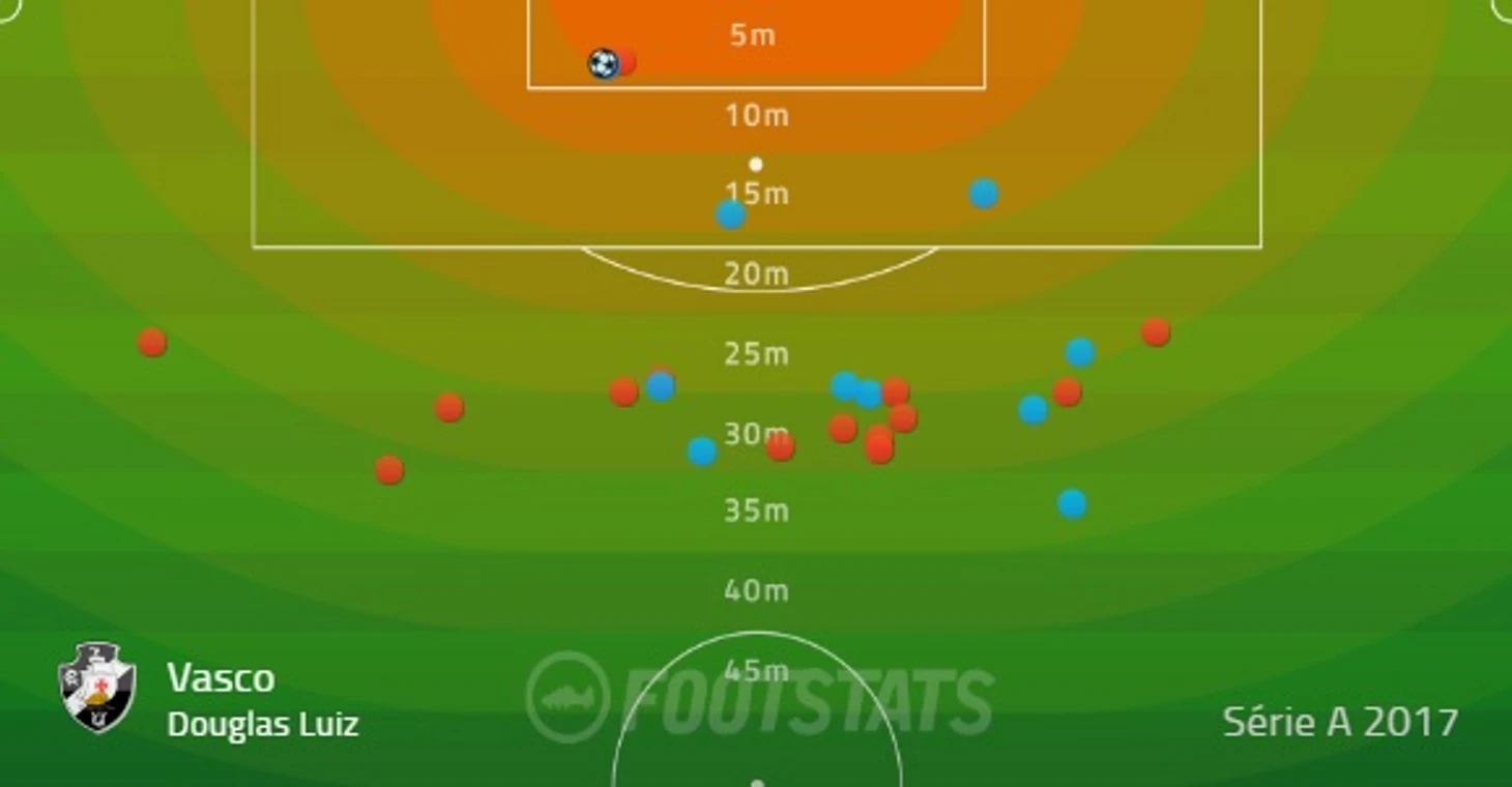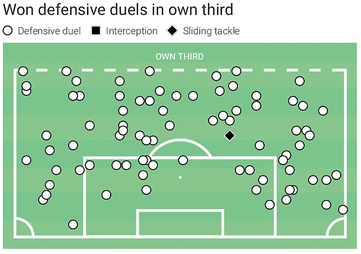 На фото выше показана карта оборонительных дуэлей Дугласа Луиза в собственной трети поля. Эти единоборства не включают в себя перехваты и подкаты, только игра 1-в-1. Впрочем, интересны и зоны участия Дугласа. В 83 единоборствах, показанных выше, 31 из них было выиграно в так называемой «зоне 14». Эта зона также известна как «лунка» и представляет собой пространство перед штрафной площадью аккурат напротив ворот, самое опасное место, которое обороняющаяся команда стремится закрыть как можно быстрее. Кроме того, Луиз выигрывает множество единоборств на флангах и в штрафной. Он стал гораздо лучше понимать свою тактическую роль и необходимость заполнять свободные пространства для подстраховки партнеров. Это подтверждается большим диапазоном участков поля, в которых он выигрывает свои единоборства.