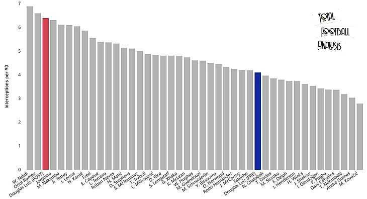 Приведенный выше график показывает резкое улучшение, которого Луиз добился в перехватах. До перерыва Луиз в среднем делал 4,10 перехвата за матч. Это был один из самых низких показателей в лиге для опорных полузащитников. Многие игроки, у которых средние показатели меньше, чем у Луиза, играли за клубы, входящие в шестерку лучших. Это и понятно, отчасти из-за того, что команды доминировали в большинстве игр, и поэтому не было особо что перехватывать. У таких игроков, как Джордан Хендерсон и Поль Погба, в среднем 3,74 и 3,38 соответственно. Однако «Астон Вилла» была далека от шестерки лучших и нуждалась в игроках с качественным отбором прежде всего.