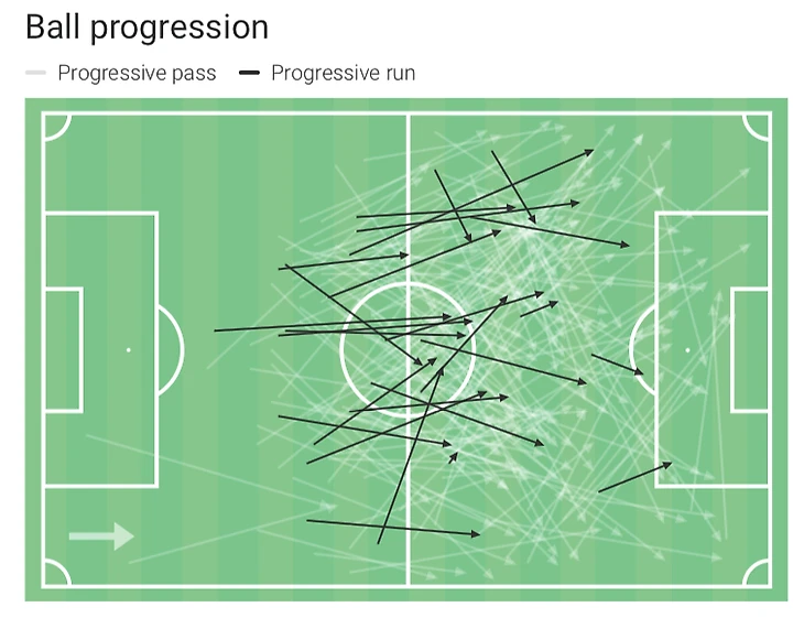 График продвижения мяча выше показывает то, что Луиз пытался чаще выполнять продвигать мяч за счет паса, чем самому тащить его (для этого, впрочем, у «Виллы» есть Грилиш), соотношение 230 к 26. И довольно с неплохой точностью- 77,8%. И здесь он умело использовал свой хороший длинный пас, выполняя с точностью в 97,1% передачи на расстояние более 40 метров, и с точностью в 95,6% в диапазоне 30-40 м. Большинство прогрессивных передач 22-летнего бразильца закончились потерей владения – 60,9% из них. Лишь 31,3% привели к опасности у чужих ворот, но, впрочем, это уже больше вопросы к атакующим игрокам и более высокому риску потери мяча при дриблинге/силовой борьбе.