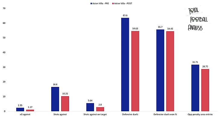Самая поразительная статистика – это количество противников xG. До того, как сезон остановили, «Вилла» имела допущенный xG 2,35 за матч. Это был один из худших показателей в лиге. Однако после рестарта это значение упало до 1,17.
