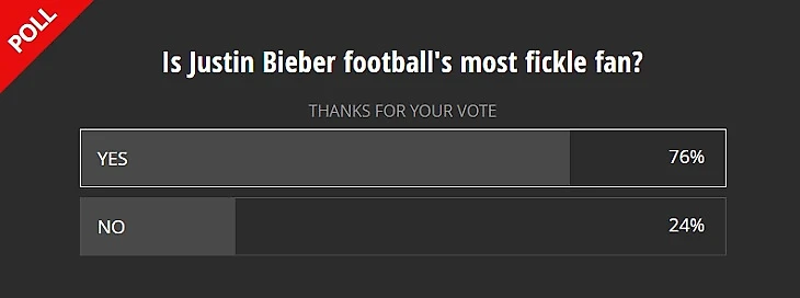 В 2016-м английское медиа Metro на сайте проводило голосование «Джастин Бибер – самый непостоянный фанат в футболе?». Вот результаты.