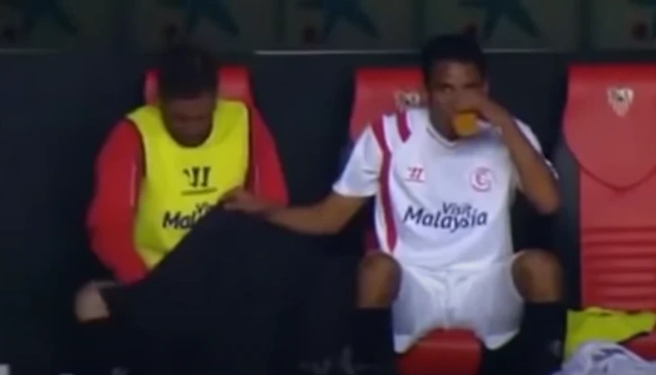 Полузащитник «Севильи» даже не принимал участие в матче против «Эльче» в 2015-м, когда ему приспичило в туалет, а сидел на скамейке запасных. Но вместо того, чтобы отлучиться на пару минут, он решил воспользоваться бутылкой. Все это дело прикрывал партнер по команде, закрыв Новарро пледом.