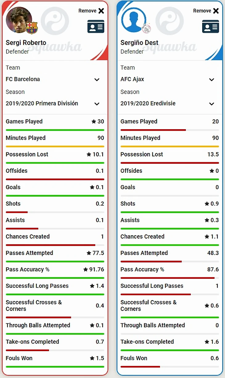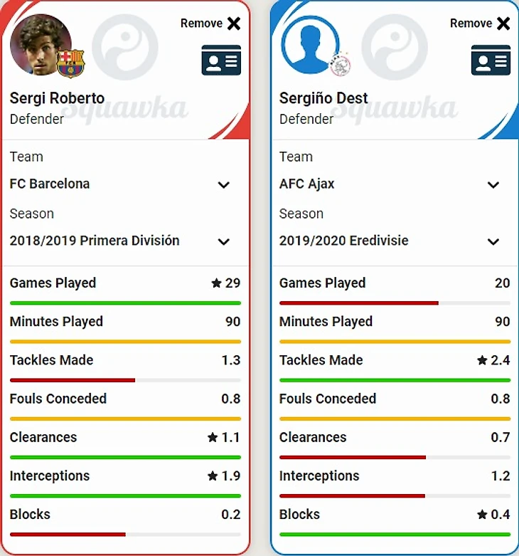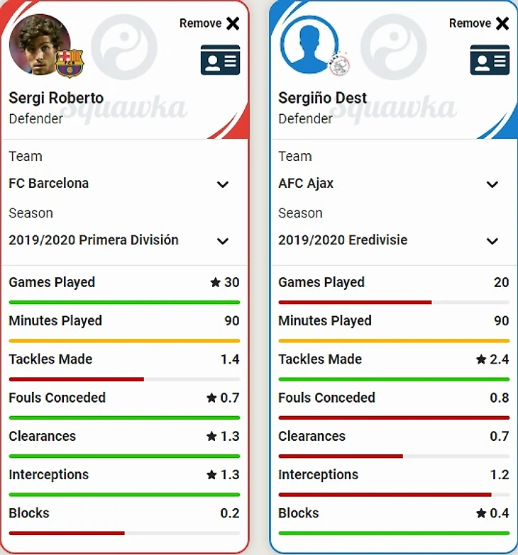 Что касается главных оборонительных действий, то в данных компонентах Дест превосходит Роберто по отборам и заблокированным ударам, но немного уступает по частоте фолов и перехватам. Серджи чаще совершает выносы.