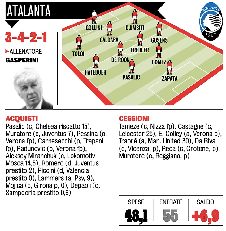 Итог трансферной работы сегодня наглядно показала главная спортивная газета Италии La Gazzetta dela Sport. По их подсчетам «Аталанта» потратила в это растянувшееся окно 48,1 млн евро, а заработала 55. То есть, потеряв всего одного игрока основы и взяв несколько дорогих новичков, клуб все равно остался в плюсе почти на 7 млн. И не удивляйтесь, если следующем летом еще парочка неизвестных парней поможет клубу из Бергамо закупиться на десятки миллионов.