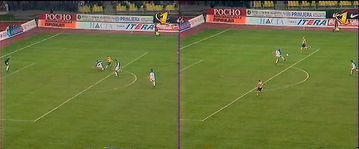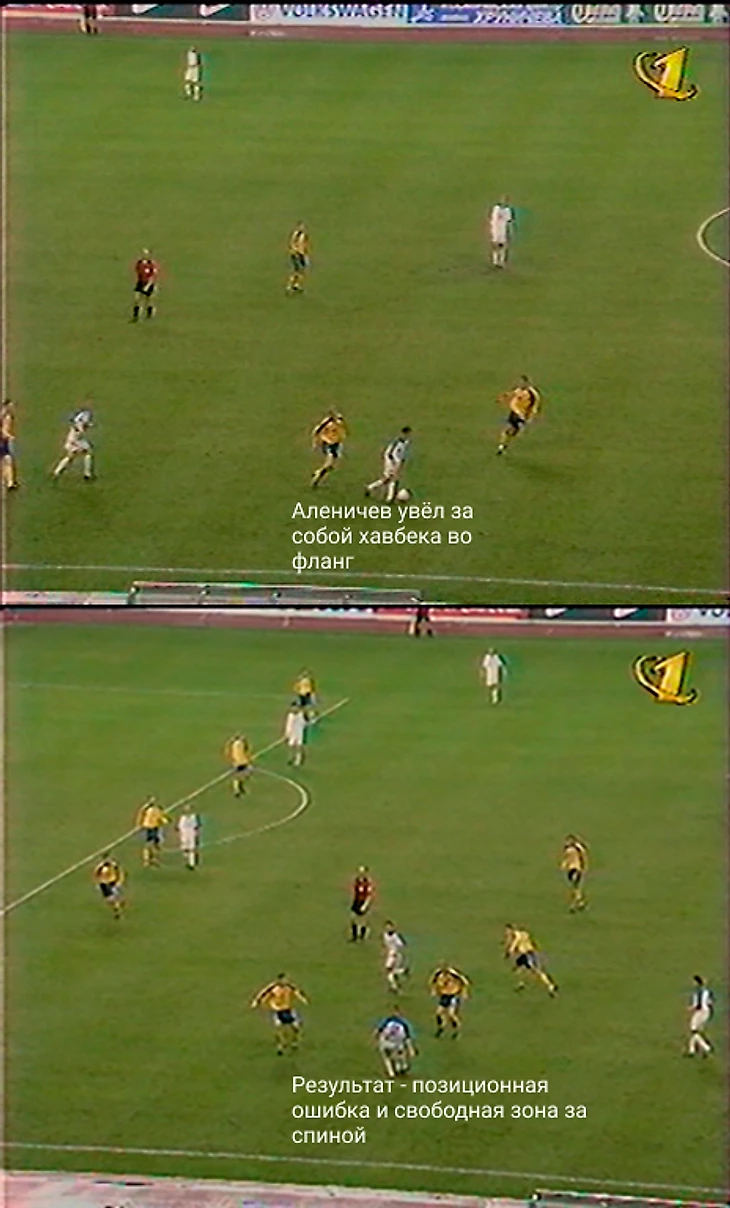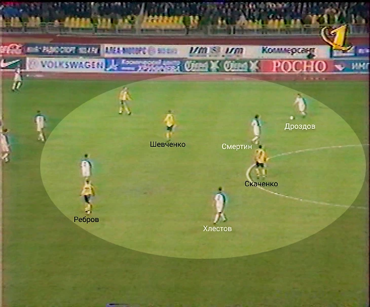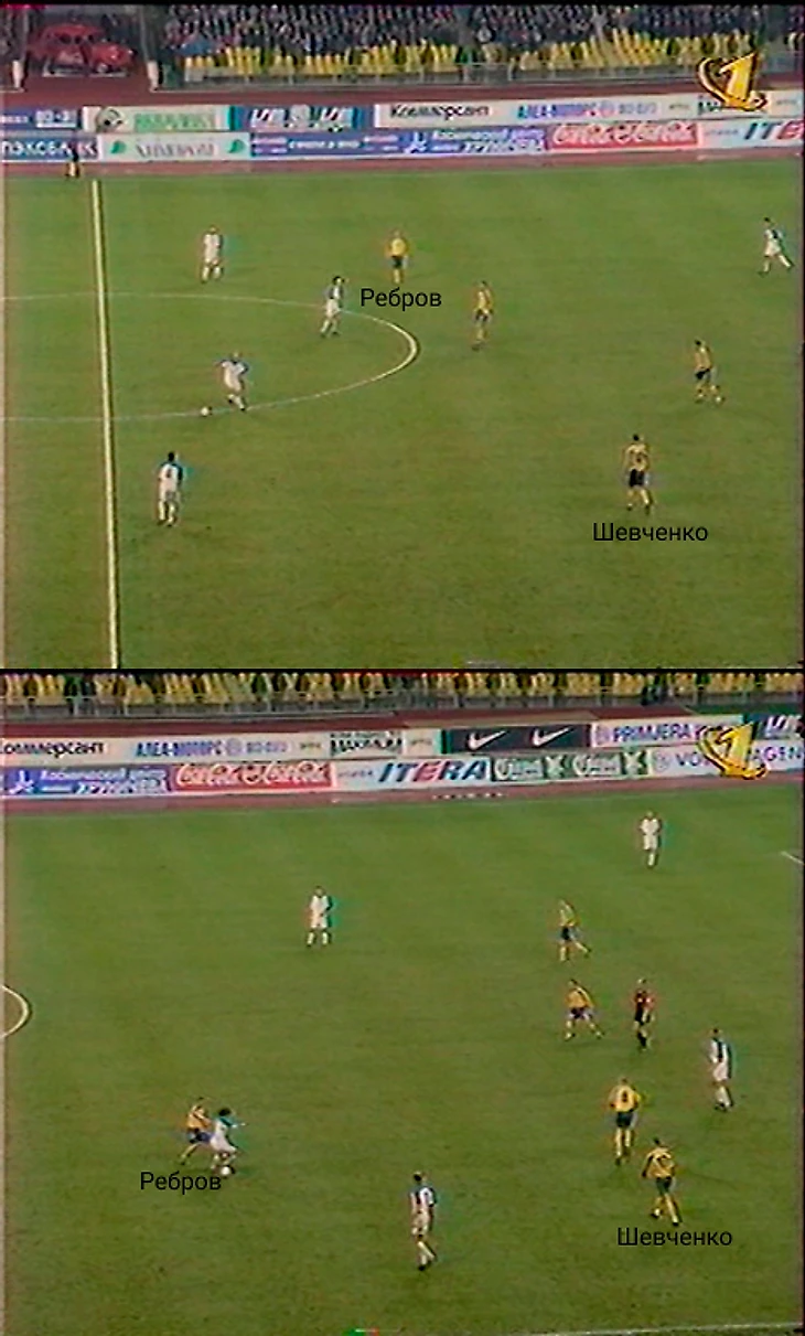 Второй – персональная опека Шевченко. Перед матчем велись дискуссии, кто будет закрывать Андрея. Шли разговоры о Хлестове и Смертине, который выключил Анелька в Сен-Дени. Выбор Романцева удивил – персональным опекуном стал Юрий Дроздов. Он выиграл свой микроматч, в чём после матча признался Шевченко. Юрий практически не проигрывал единоборства и не давал себя проходить.