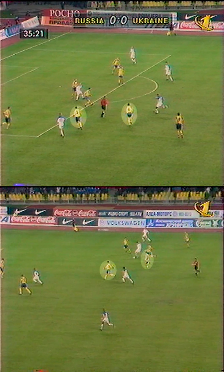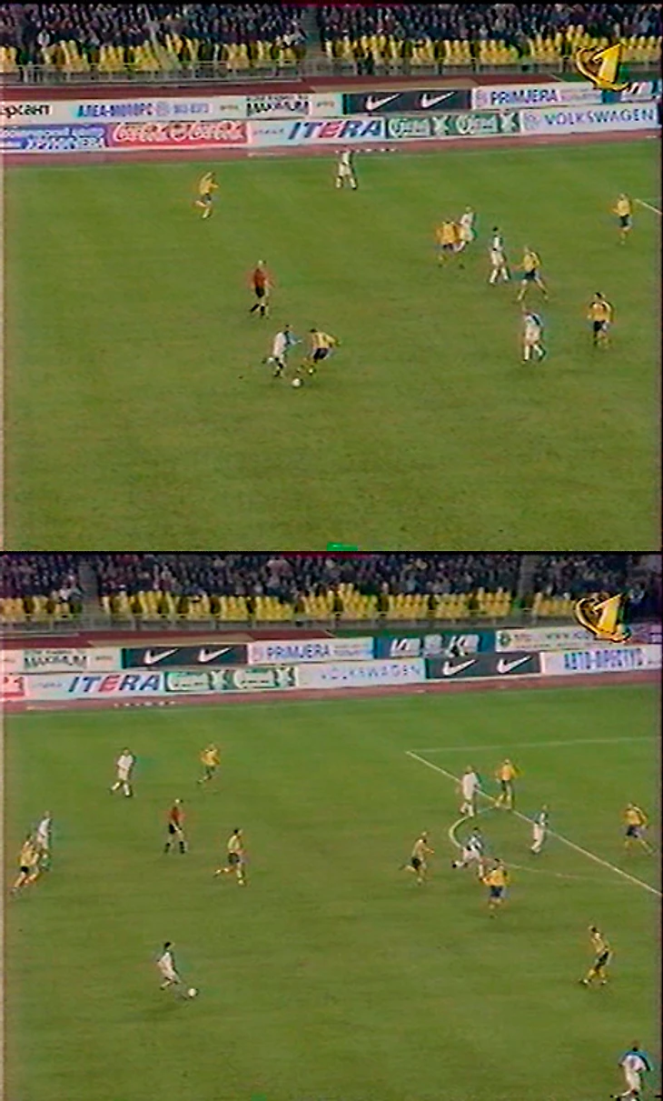 14. После забитого гола Романцев сделал вполне логичную замену. Было ожидаемо, что Украина пойдёт вперёд, поэтому вместо Панова вышёл Семак, расположившийся в центре поля. Штурм сборной Украины не давался, россияне уверенно отбивались и умело выходили в контратаки. Произошедшее далее состоит из двух микроэпизодов.