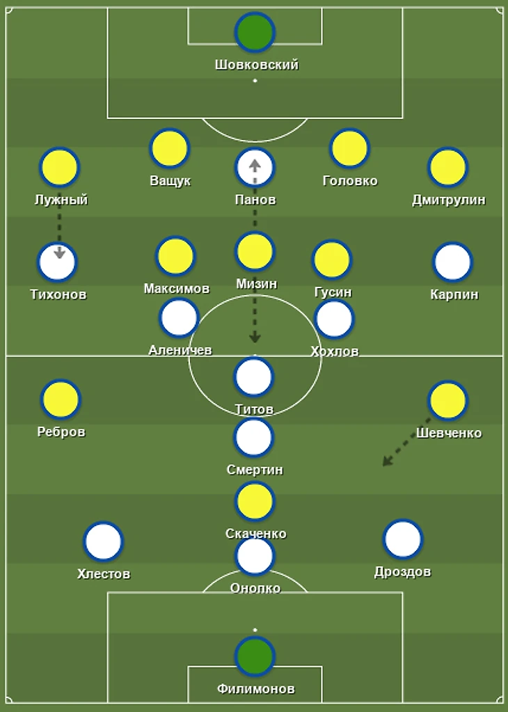 Логично, что выход Микитина рассчитан для исправления дисбаланса в центре поля путём его насыщения. После первых 15 минут второго тайма было видно, что нашим парням никак не удаётся разгадать квест в центре поля, тогда как крайние защитники никак не задействованы.
