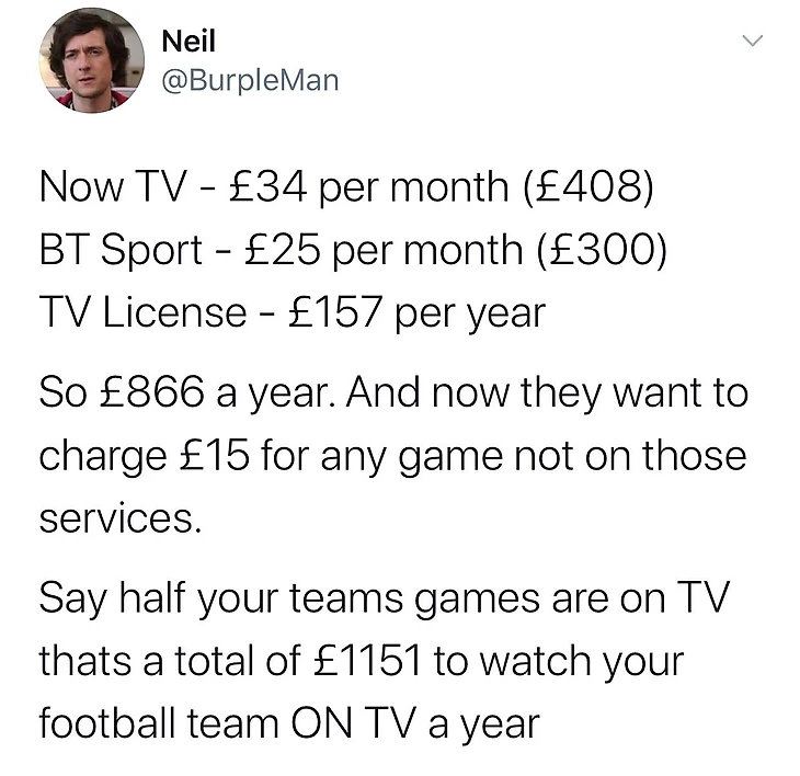 Это стоимость за просмотр всех матчей АПЛ. Понятно, что следить за одной командой получается чуть дешевле. Например, вот этот пользователь твиттера посчитал, что стоимость просмотра матчей любимой команды по ТВ составляет £1151 в год (при допущении, что половину игр твоей команды показывают бродкастеры, а половину – по PPV).