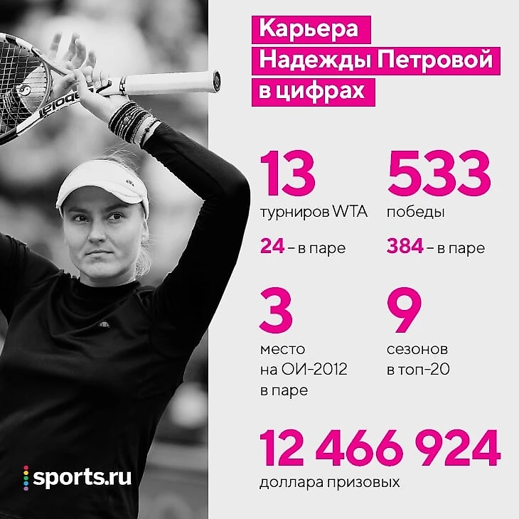 Надежда Петрова – из поколения русских теннисисток, которые властвовали над WTA в нулевые и начале десятых. Она не выиграла турнир «Большого шлема» даже в паре, как Веснина или Звонарева, но была суперстабильна (всего раз за 10 сезонов выпала из топ-20) и неудержима, когда у нее шла игра: победные финалы с пиковыми Моресмо, Энен и Возняцки, два попадания на итоговый, бронза Олимпиады-2012 в паре с Кириленко.