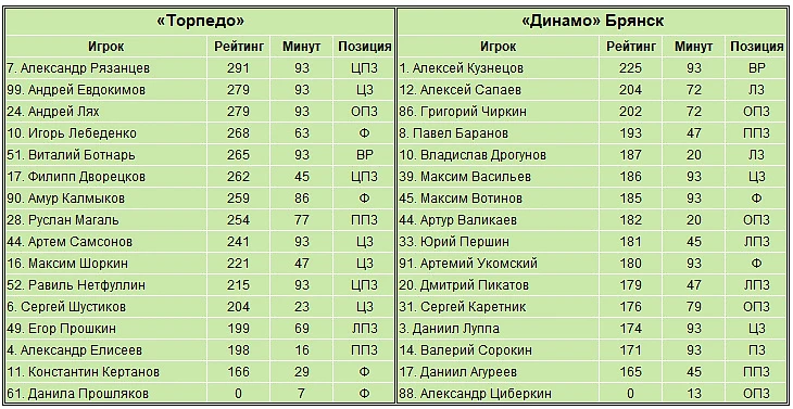 Красным цветом у «Торпедо» выделены футболисты, не попавшие в стартовый состав команды на матч предыдущего тура в Омске.