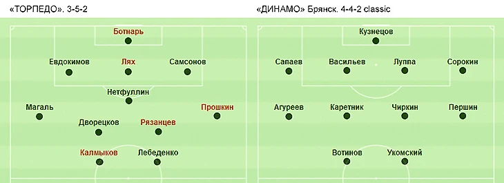 «Динамо» (Брянск) использовало классический вариант расстановки 4-4-2. По ходу сезона оно сделало это второй раз. Еще в одном случае брянцы использовали вариант расстановки 4-4-2 с ромбом в полузащите. Добавим, что в 13 официальных матчах сезона бело-голубые играли с четырьмя защитниками (4-4-2, 4-1-4, 4-2-3-1, 4-3-3) и лишь в одном – с тремя. Напомним, что 25 июля команды играли товарищеский матч, и там «Динамо» тоже использовало против «Торпедо» классический вариант расстановки 4-4-2.