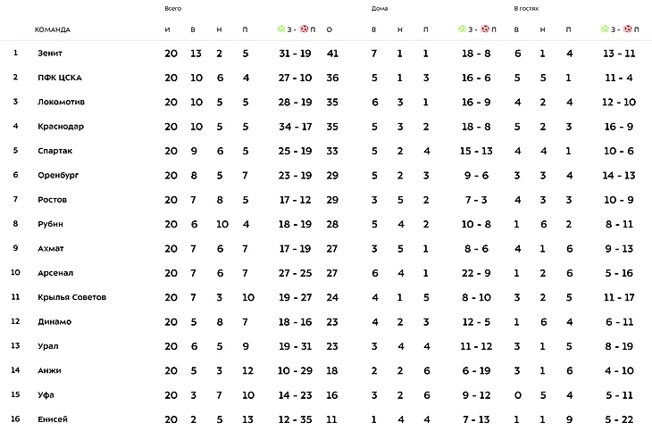 Турнирная таблица РПЛ после расторжения контракта в Вадимом Евсеевым.