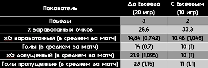Статистика ФК Уфа до и после назначения Вадима Евсеева в качестве главного тренера в сезоне 2018-2019.