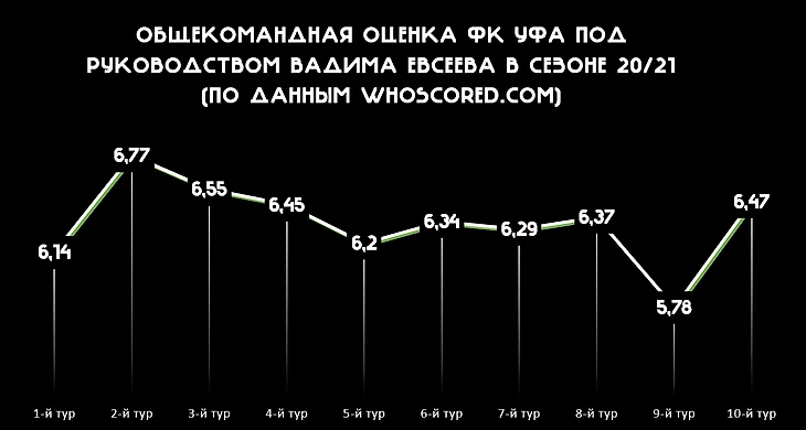 Команда успела побить несколько антирекордов. Во-первых, Уфа повторила худший старт в чемпионате. Такое же количество очков в первых 10 турах уфимский клуб набрал только в 2015 году при Игоре Колыванове (после 12-го тура Игорь Владимирович был отправлен в отставку). В этом сезоне команда Вадима Евсеева забила 5 мячей, что тоже является повторением антирекорда (в 2016 году под руководством Виктора Гончаренко башкирская команда за 900 минут игрового времени также смогла отпраздновать забитый гол только 5 раз, однако коллектив белорусского специалиста 3 раза добился победы и 3 раза сыграл вничью, что явно нивелирует факт низкой результативности).