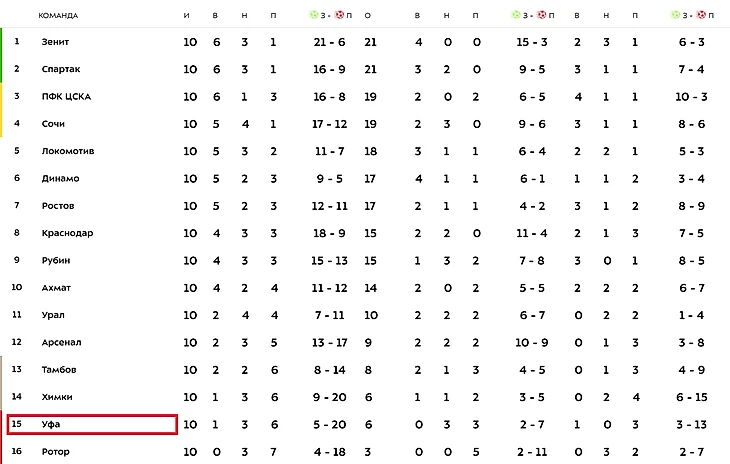 Турнирная таблица РПЛ в момент назначения Вадима Евсеева главным тренером ФК Уфа.