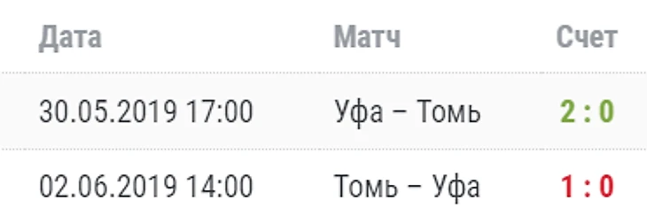 Результаты стыковых матчей Уфы и Томи в сезоне 2018-2019 гг.