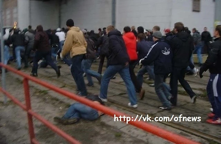 В это время приехал один уазик с милицией, которого москвичи, как они говорят, и испугались (а вовсе не выхода нашего состава на улицу). Не поверю. Короче кого догоняли – били сильно, весь путь отступления был усеян москвичами, и бежали они, оставляя своих на наше усмотрение. Потом правда приехало много ментов, и началось вязалово. Бежали многие вместе. Многих москвичей доставали из машин, на которых они хотели уехать. Были наши, которые на одних машинах вместе с москвичами уезжали. Многих оппонентов били в присутствии милиции, многих потом в лесу на горах. Одну группу валили возле китайского посольства, там они ломились к охране с криками о помощи. Другую группу прибили под метро Арсенальная, «Беркут» помешал добить всех, пару человек убежали (наших было человек семь, москвичей человек пятнадцать, у одного из них в этой драке в руке был нож, он ему правда не помог). Валили оппонентов и в центре – старые прыгнули на колонну москвичей под стадио (их «Беркут» на сектор вел). Трое старых было, но москвичи и не думали отбиваться, а старых повязали…