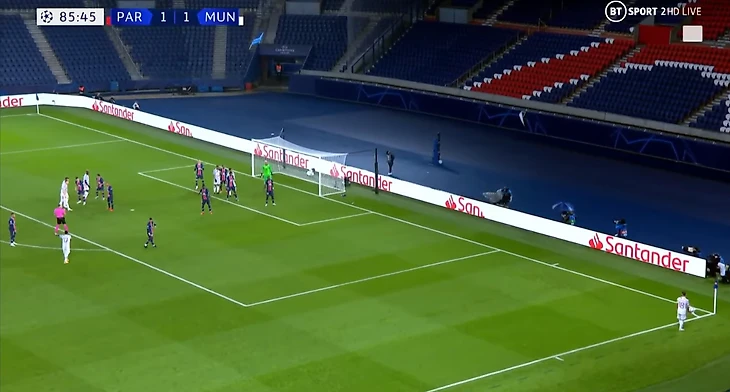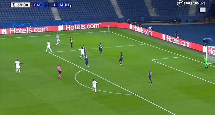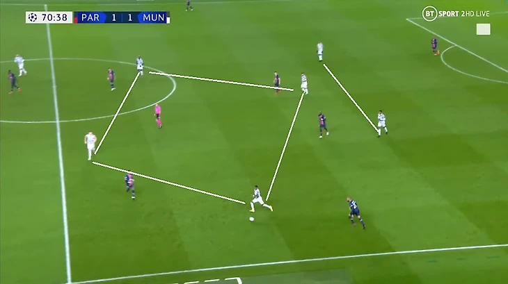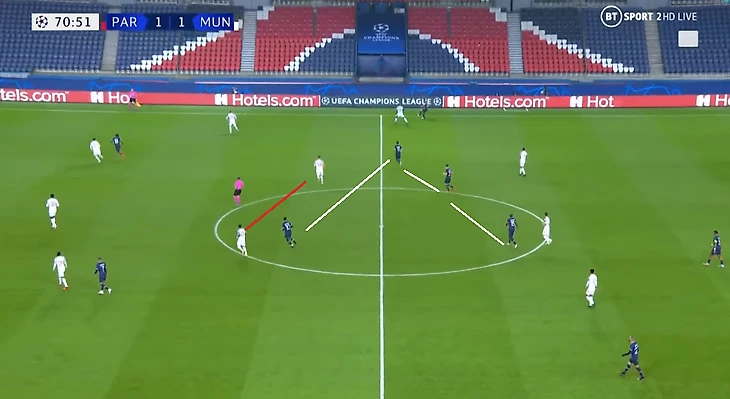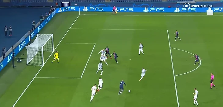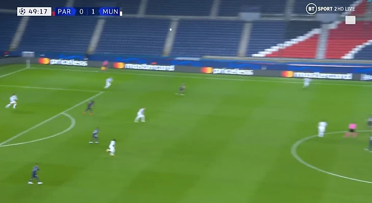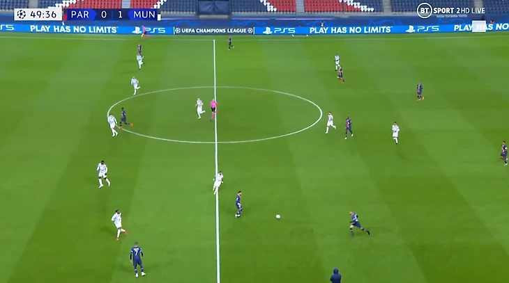 На не чёткой картинке можно заметить разрывы между линиями ПСЖ. С самого начала, у ПСЖ был дисбаланс в составе. Центр полузащиты, который в основе своей не поддерживает атаку, а игроки сами по себе больше оборонительные, поэтому они не подключаются.