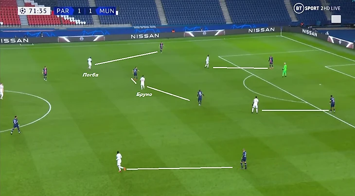 И ещё пример. Погба и Бруно во время прессинга вынуждены разрываться между игроками ( у Погба игрок за спиной ) . Навас предпочёл просто выбить мяч, хотя с розыгрышем на третьего, можно было за 3 передачи пройти центр поля.