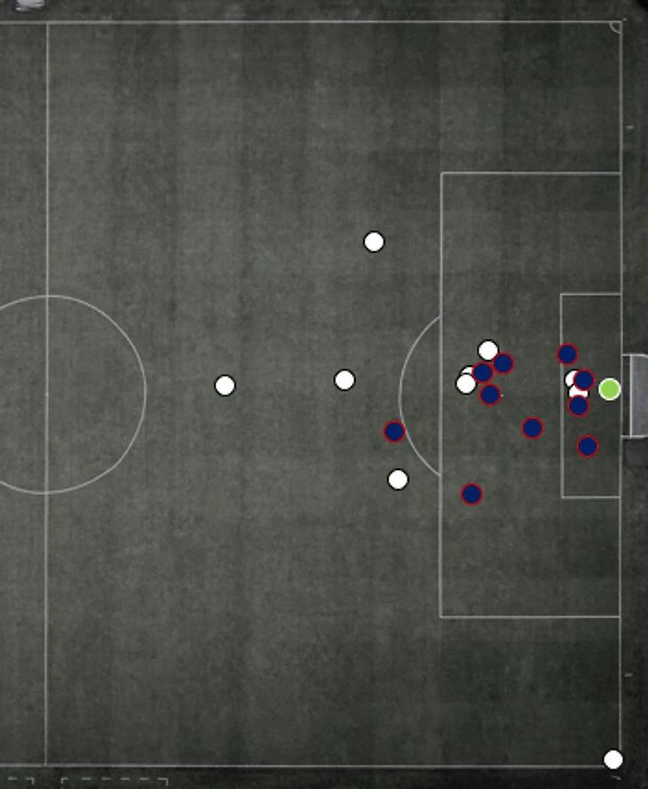Это угловой от МЮ. Точки в белом - Манчестер, точки в чёрном - ПСЖ. Весь состав ПСЖ кроме одного игрока в своей штрафной, против 6-и игроков МЮ. Впереди и во всё никого нету. Не может так играть команда, которая хочет победить. ( Через минуту им забьют гол )
