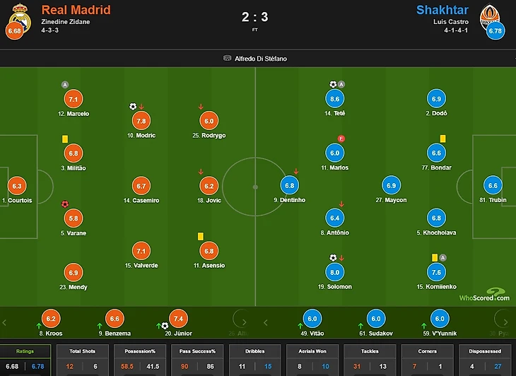 К сожалению уступаем в первом матче группового этапа ЛЧ. «Шахтер» смог обыграть «Реал» в Мадриде, ведя в первом тайме 3:0. Команде Зидана явно нужна перезагрузка. WhoScored опубликовал оценки за матч.