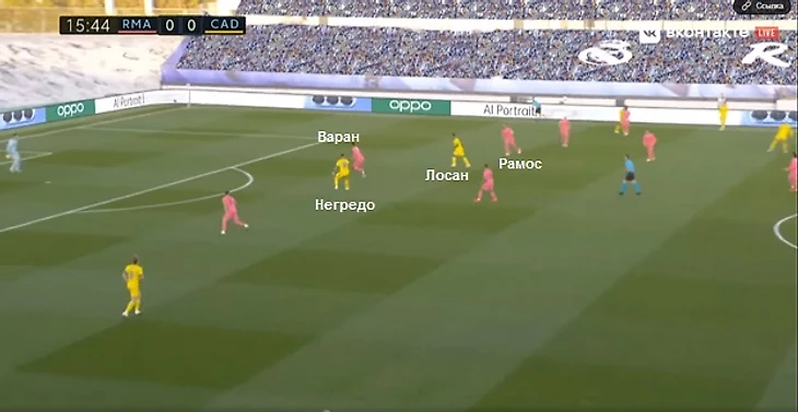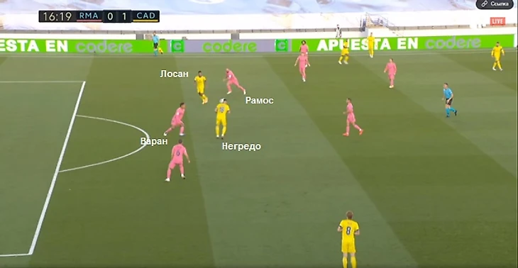 4. Недопонимание в линии обороны «Реала» в моменте с пропущенным голом. Рамос поднял оборонительную линию, оставляя за своей спиной достаточно большое пространство для вбегания игрока соперника. Варан остался на своей позиции, контролируя своего игрока, на которого пошел заброс. Французу пришлось поворачивать свой корпус в противоположную сторону, тем самым он потерял время на то, чтобы накрыть соперника на приеме и постараться выиграть мяч на «втором этаже». Как раз на этом противоходе его подловил нападающий «Кадиса» Альваро Негредо, скинув мяч в то пространство, которое открылось благодаря высокому положению Рамоса. Лосано вбежал в данную область и реализовал свой момент.