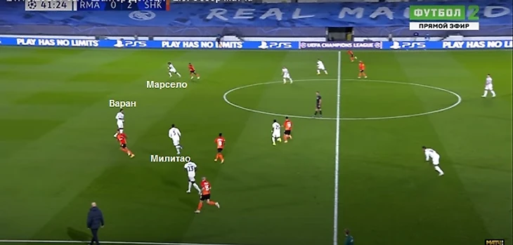 Если обратить внимание на момент с первым голом «Шахтера», то можно заметить, что оборонительная линия «Реала» ломаная. Милитао пытается встречать игрока, за которым Асенсио уже не успевает, хотя это только 29 минута матча. Игрока «Шахтера» обыгрывает Эдера один в один, смещаясь в центр стягивает на себя и Варана, и Марсело.