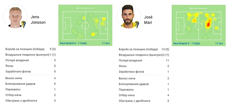 1. «Реал» встретился с соперником, который очень организованно играет в обороне. «Кадис» без мяча на своей половине поля перестраивался из 4-4-2 в 4-4-1-1, либо в 4-5-1 в зависимости от того, опускался ли один из пары нападающих в линию полузащиты, или нет. Таким образом, команда Червера Диаса насыщала центр, усложняя розыгрыш мяча через данную область. При попытке «Реала» продвигать мяч за счет паса через центральную ось, игрока тут же накрывали, и совершали отбор. Показательна статистика центральных полузащитников «Кадиса» Йенса Йонссона и Хосе Мари. У каждого по одному перехвату, по два и четыре отбора, соответственно, и столько же выносов мяча.