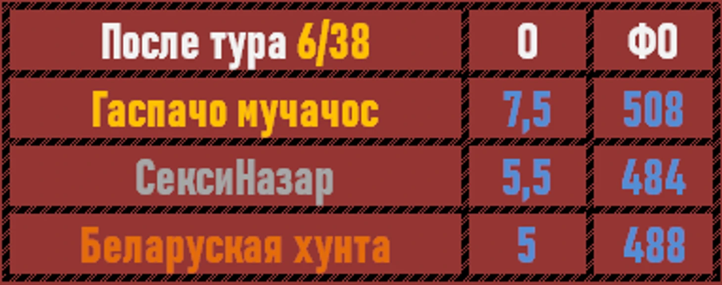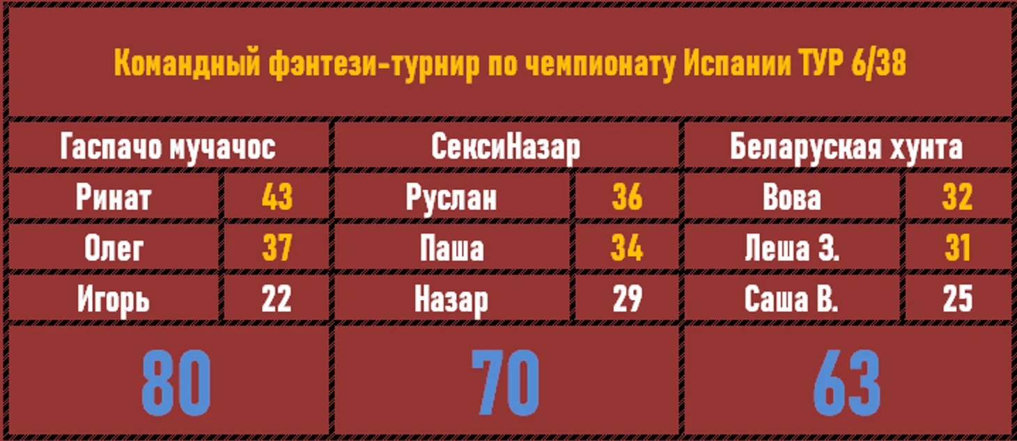 Довольно смело начинает отрываться от преследователей команда Гаспачо мучачос. Лишь в одном из туров ребята не набрали ни одного очка. Теперь же - уверенная победа! Удачи коллективу и преследователям! Интересно, как же повлияет на набор ФО Эль Класико?