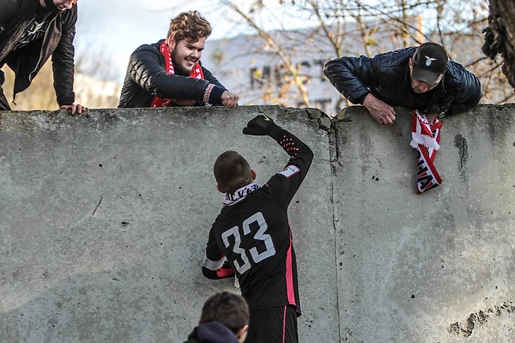 Вчерашний матч проходил без зрителей, но поддержать своих футболистов в игре против «Олимпа-Долгопрудного» болельщики смогли при помощи стремянок.