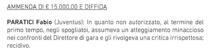 Спортивный директор «Юве» Фабио Паратичи снова оштрафован спортивным судьей. Оказывается, в перерыве матча «Ювентус» – «Верона» Фабио проник у судейскую раздевалку, где критиковал арбитров матча (возможно, эпизод с офсайдом Мораты).