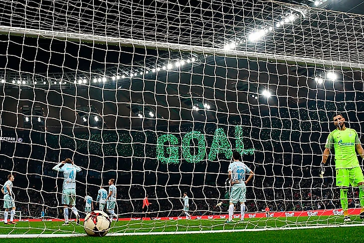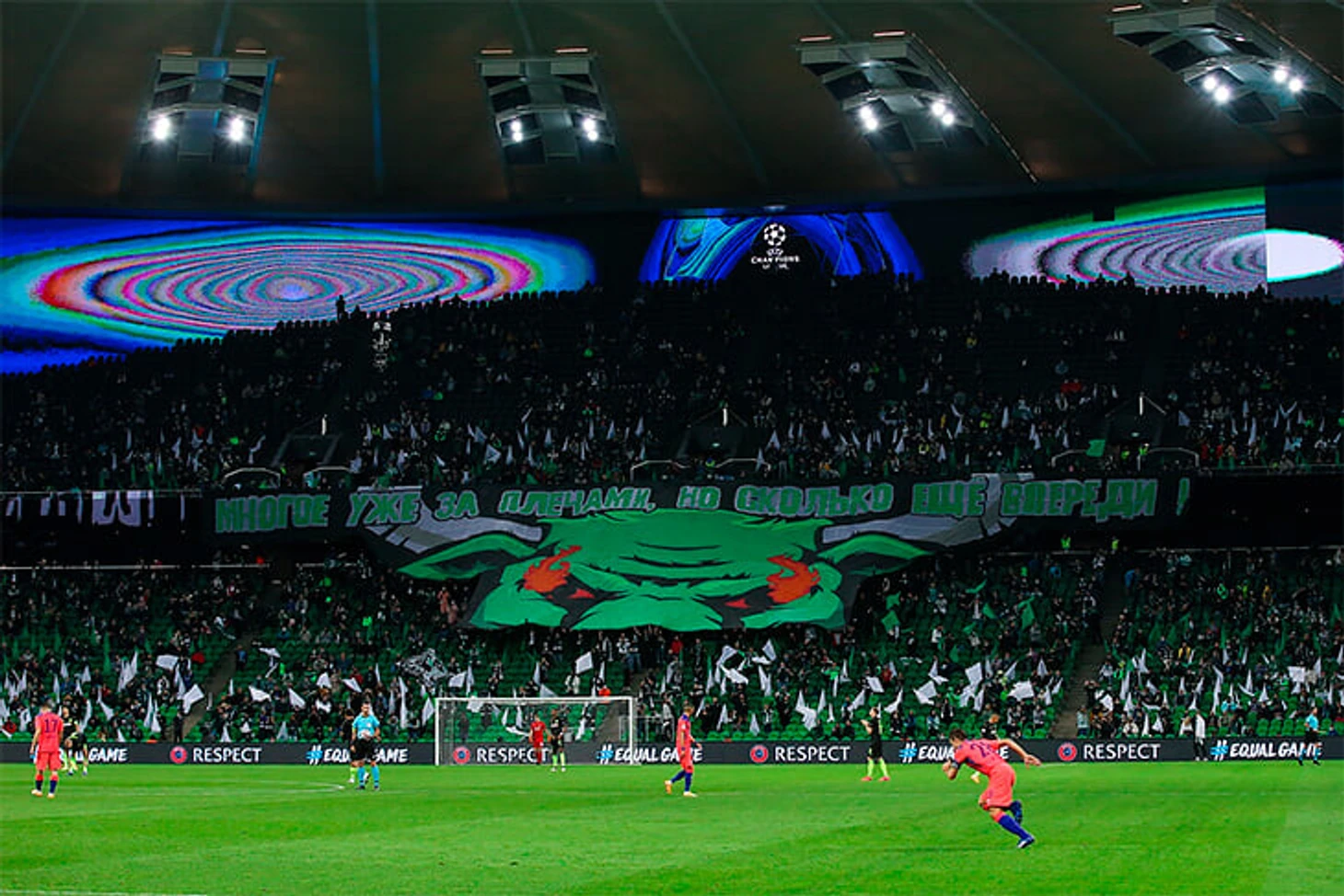 В Краснодаре собирались удивить фирменной фишкой – артом в центральном круге (если помните, прямо там выстригали фигуру быка, еще на траве изображали футболки с номерами Гранквиста с Жоазиньо, когда они уходили). Его даже подготовили: фактически перенесли на газон изображение с полотна, которое в Лиге чемпионов растягивают в центре поля и трясут под гимн. Все же по просьбе УЕФА в итоге пришлось вернуть классическую ровную траву – но красивый таймлапс-ролик все равно остался.
