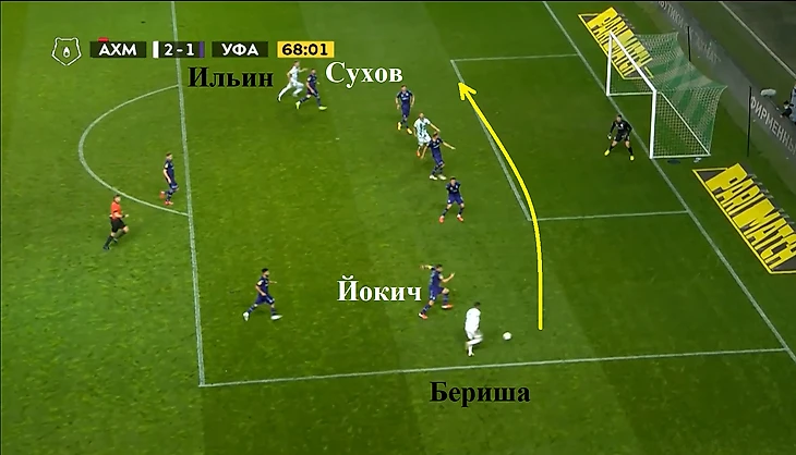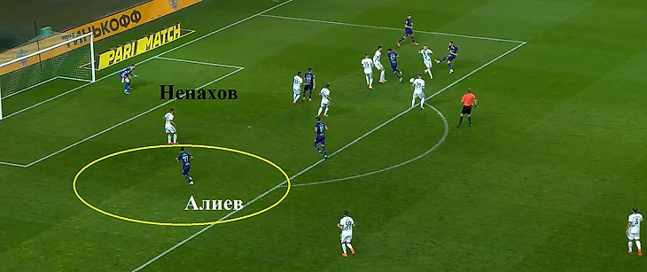 В ситуации с забитым мячом Уфы необходимо отметить хорошее открывание в свободную зону Азера Алиева и низкое качество игры в обороне правого защитника Ахмата Ненахова, который оставил без внимания футболиста башкирского клуба.