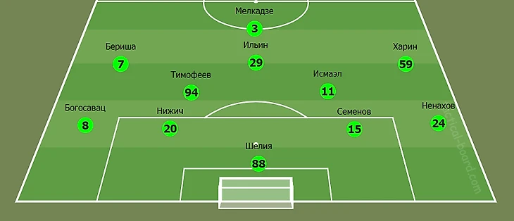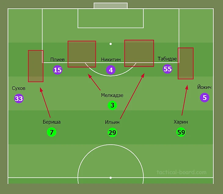 Главный тренер гостей был вынужден вносить изменения в состав и выпустил на поле защитника Анхеля. Поскольку на поле находилось два скоростных игрока в лице Бериши и Мелкадзе, для наставника хозяев важную роль играл выбор футболиста, который должен был стать главной угрозой для обороны противника в контратаках. Андрей Талалаев заменил Георгия. Это решение (на мой субъективный взгляд) в бОльшей степени повлияло на исход матча в целом.