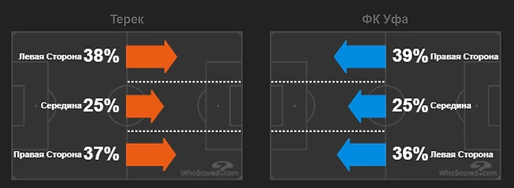 Важнейшей составляющей нападения подопечных Андрея Талалева являлись длинные передачи в зоны между защитников Уфы. По количеству точных пасов на большую дистанцию Ахмат занимал 2-е место в лиге. Использование забросов было оправдано наличием в составе грозненцев быстроногих Бериши и Мелкадзе. За весь матч хозяева поля 80 раз использовали длинные передачи как вариант развития атаки. Данная тактика принесла плоды уже в начале игры. На 14-й минуте очередной заброс на Беришу застал врасплох оборону Уфы.