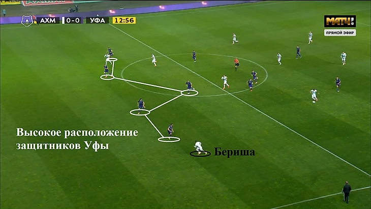 Применение данного приема помогало Уфе заставлять соперника терять мяч и делать перехваты (11 раз из 22 Ахмат лишался мяча на своей половине поля).