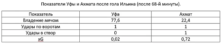 Во-первых, грозненцы уделяли особое внимание контратакам (в том числе из-за численной разницы в составах после 58-й минуты). Во-вторых, Ахмат нанес больше ударов в створ ворот. Переход на игру в три нападающих не помог Рашиду Рахимову добиться положительного результата, ведь сложно забивать голы без ударов по воротам (если конечно не играть против Спартака). В-третьих, подопечные Андрея Талалаева создали больше опасных моментов и заработали 2,54 xG, в то время как Уфа 0,42 (важно отметить, что данный показатель оценивает коэффициент опасности удара и подобная разница являлась следствием расхождения количественного показателя ударов по воротам). В-четвертых, очень важно отметить огромное преимущество Ахмата по ключевым передачам (у хозяев поля 8 точных ключевых передач, у Уфы – 0). На поле у башкирской команды отсутствовал футболист, который мог бы обострить игру одной передачей. В прошлом сезоне в команде Вадима Евсеева с этой функцией неплохо справлялся Даниил Фомин. После ухода Оливье Тилля в составе Уфы сложно найти футболиста с необходимыми качествами. Ну и нельзя не отметить преимущество Андрея Талалаева в реакции на происходящее на поле, которая была отражена в своевременности замен.