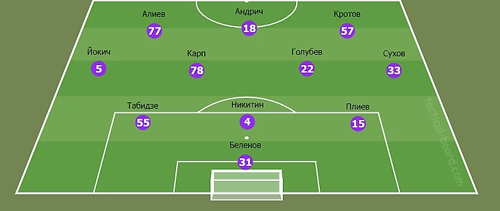 Вячеслав Кротов, Азер Алиев и Андрич составили трио нападения. Центр поля заняли Голубев и Карп.
