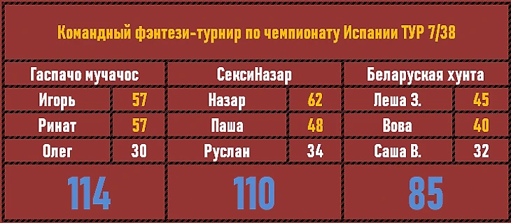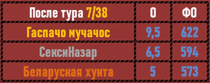 Героический результат Назара в туре не помог команде, названной в честь Назара, забраться на верхнюю ступень пьедестала. Зато команда уверенно отрывается от Беларуской хунты. А вот одинаковый результат лидеров Гаспачо мучачос в сумме принес победу именно этому коллективу. Поздравляем!