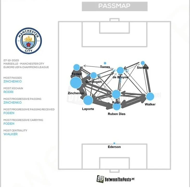 Почему стоит рискнуть? Вот Passmap с матча против Марселя. Есть вероятность, что будет играть на такой же позиции, ввиду того, что получил похвалу за свою игру от Пепа. Если у вас есть уверенность, что вы взломали «рулетку Гвардиолы» и он выйдет в старте, то это очень хороший дифференциал с владением 0.8%