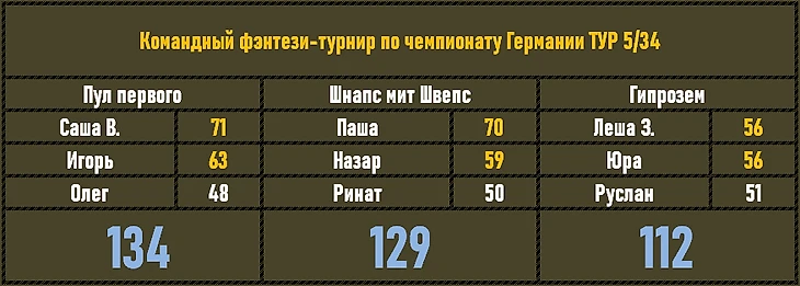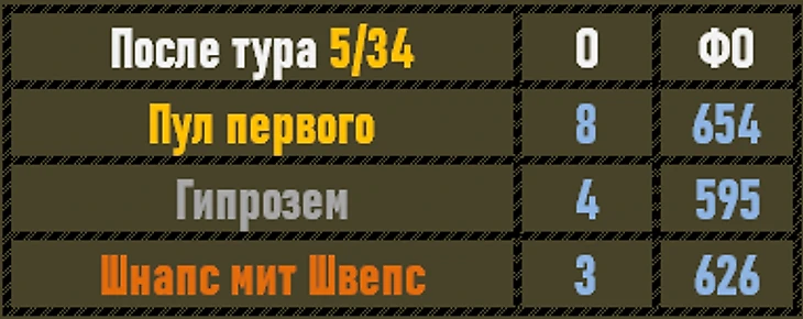 Гипрозем бросает из крайности в крайности - вновь безликая игра без индивидуальных сильных результатов. Пять туров - а у команды 2 чистые победы и 3 поражения. Итого 4 балла, что позволяет пока превосходить не очень стабильных и удачливых Шнапс мит Швепс. Ну, а команду Пул первого - с прекрасной победой!