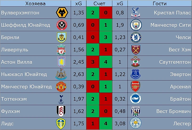 Результаты матчей 7 тура АПЛ в контексте xG - ожидаемых голов.
