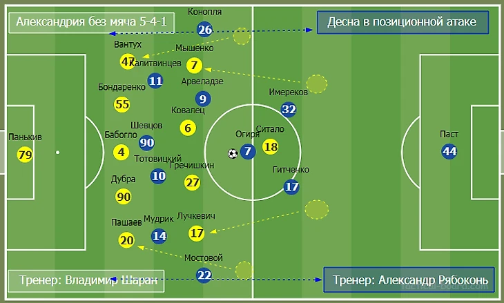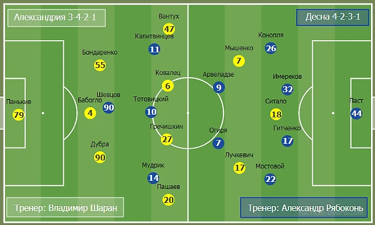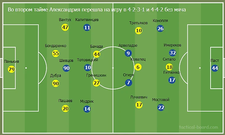 На второй тайм Шаран внес серьезные коррективы. Вместо центрбека Бабогло вышел опорник Банада и команда перешла на свои традиционные 4-2-3-1. Это перевернуло ход матча. Александрия перехватила инициативу и забила два гола, а подключения Банады в штрафную сыграли одну из важнейших ролей.