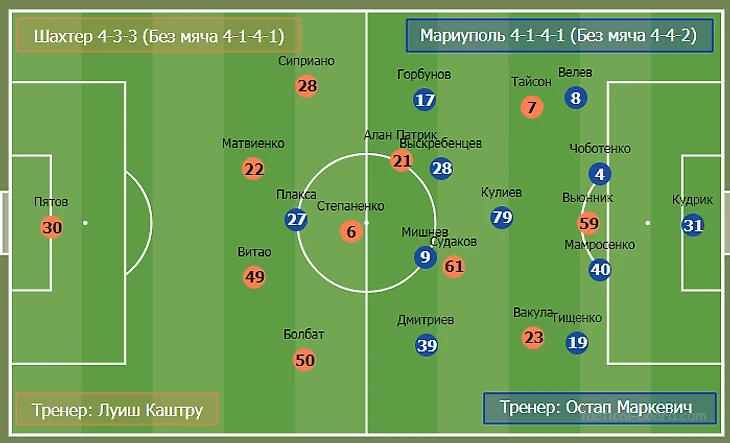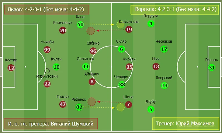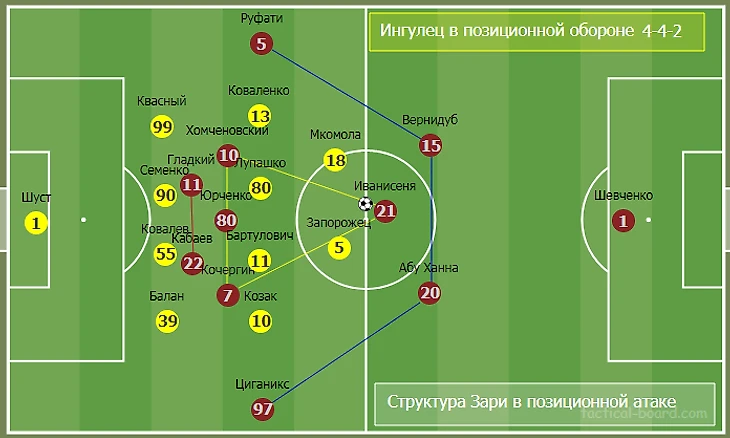 В отличие от последних матчей Маркевич сыграл не в 4-2-3-1, а 4-1-4-1 с Кулиевым в роли опорного. В фазе игры без мяча команда, как и ранее, перестраивалась на 4-4-2. Смещения игроков отмечены на схеме перестроения команд.