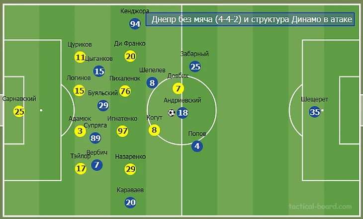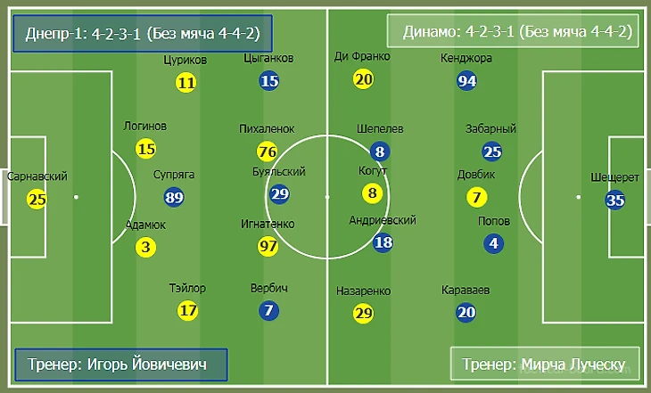 Йовичевич начинал в Днепре со схемой 4-1-4-1, но в Киеве сыграл в 4-2-3-1. В позиционных атаках левый фулбек Цуриков подключался в атаку, а правый защитник Лукас Тейлор оставался в линии обороны. За счет оригинальной роли бразильца в фазе игры с мячом Днепр-1 переходил на игру в три защитника. Также отметим, что с 77 минуты матча Днепр-1 перестроил и базовую схему на 3-4-1-2. Отчаянная попытка отыграться не увенчалась успехом.