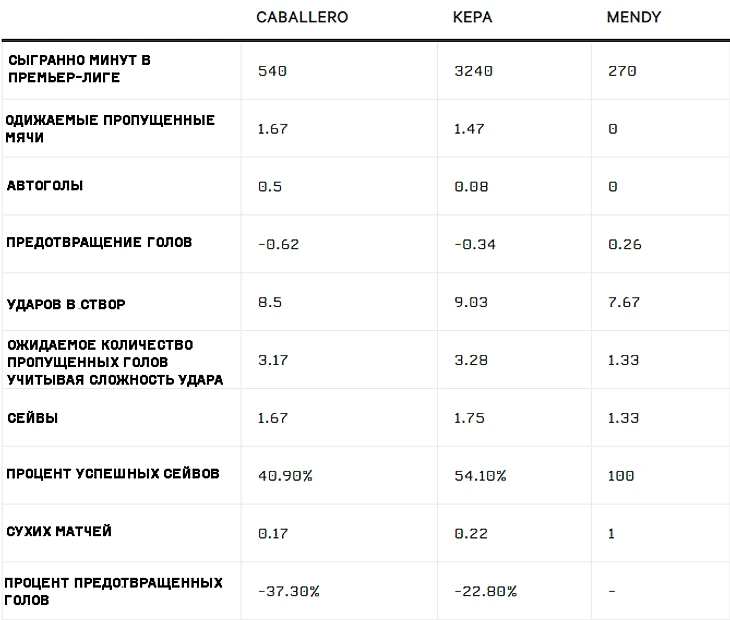 В этой таблице показано, что Менди пропустил на 0,26 гола за матч меньше, чем должен был. Но более важно, что Кабальеро (-0,62) и Кепа (-0,34) пропускают гораздо больше.