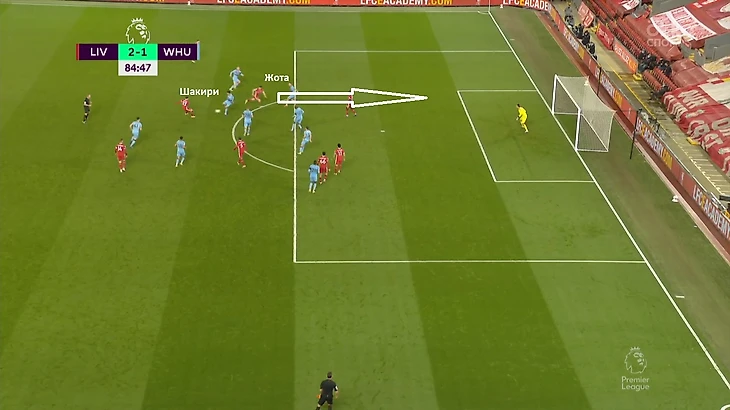 В 7 туре АПЛ Ливерпуль принимал Вест Хэм. На 70 минуте вместо Фирмино выходит Жота и на 85 минуте забивает гол, классно прорвавшись с мячом к воротам соперника после передачи Шакири.